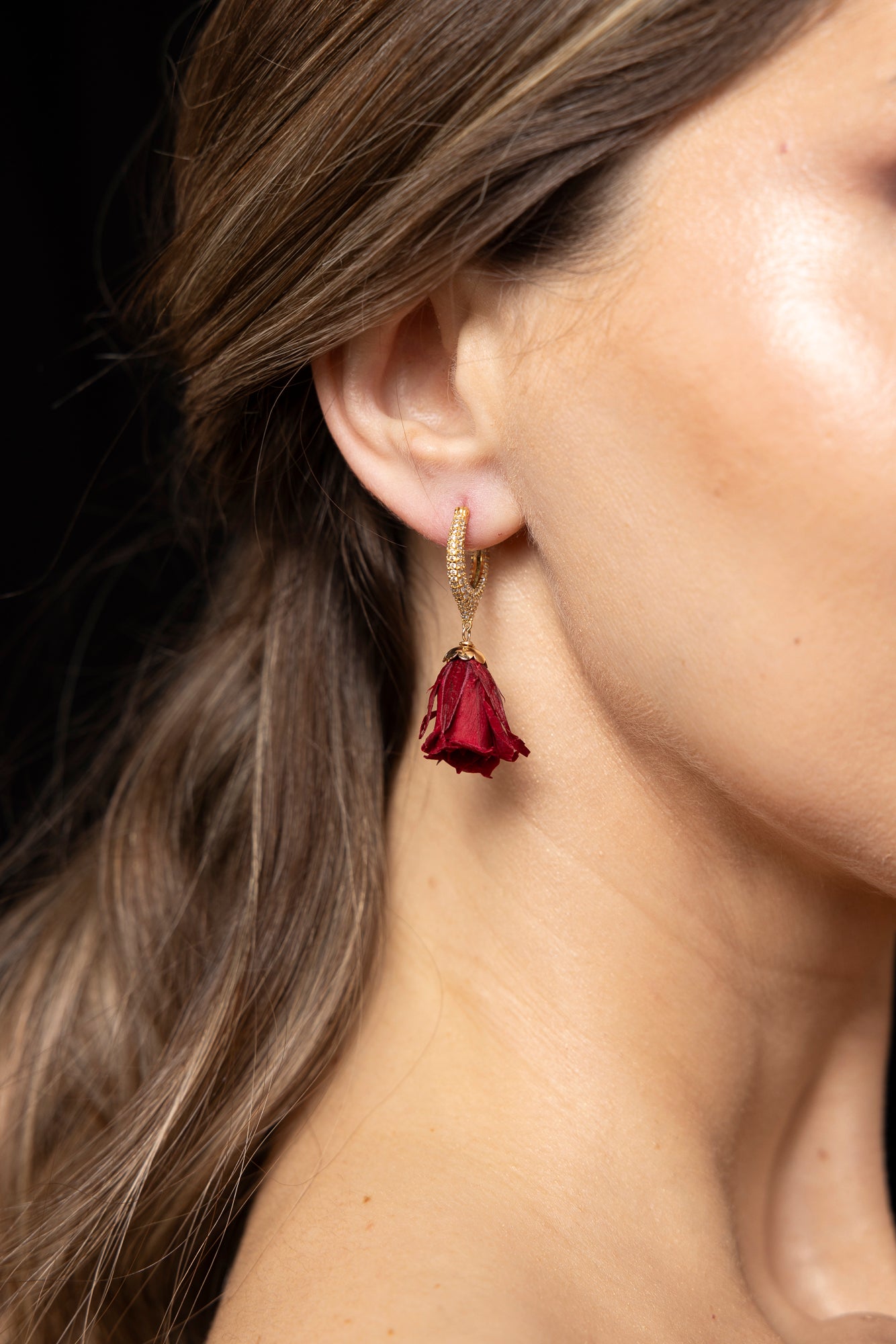 Pave crystal hoop earrings add sparkle and elegance to your look. These are easy to wear anywhere, anytime. Roses are shown in wine and light green