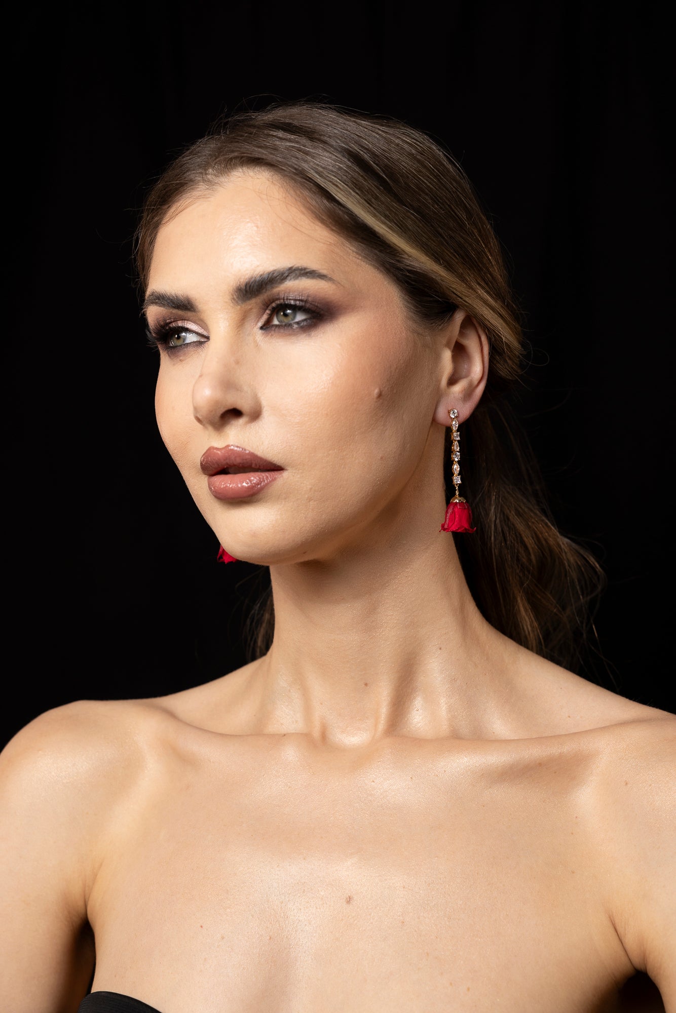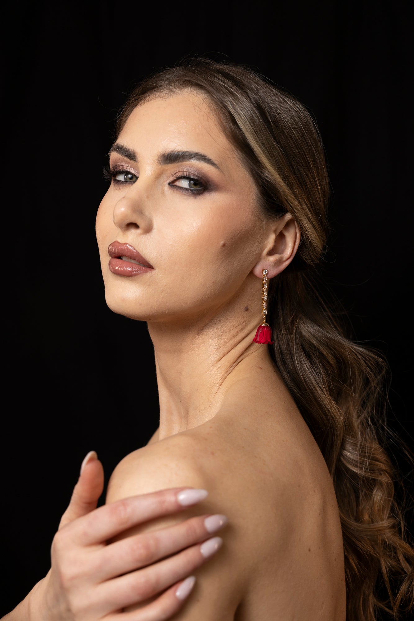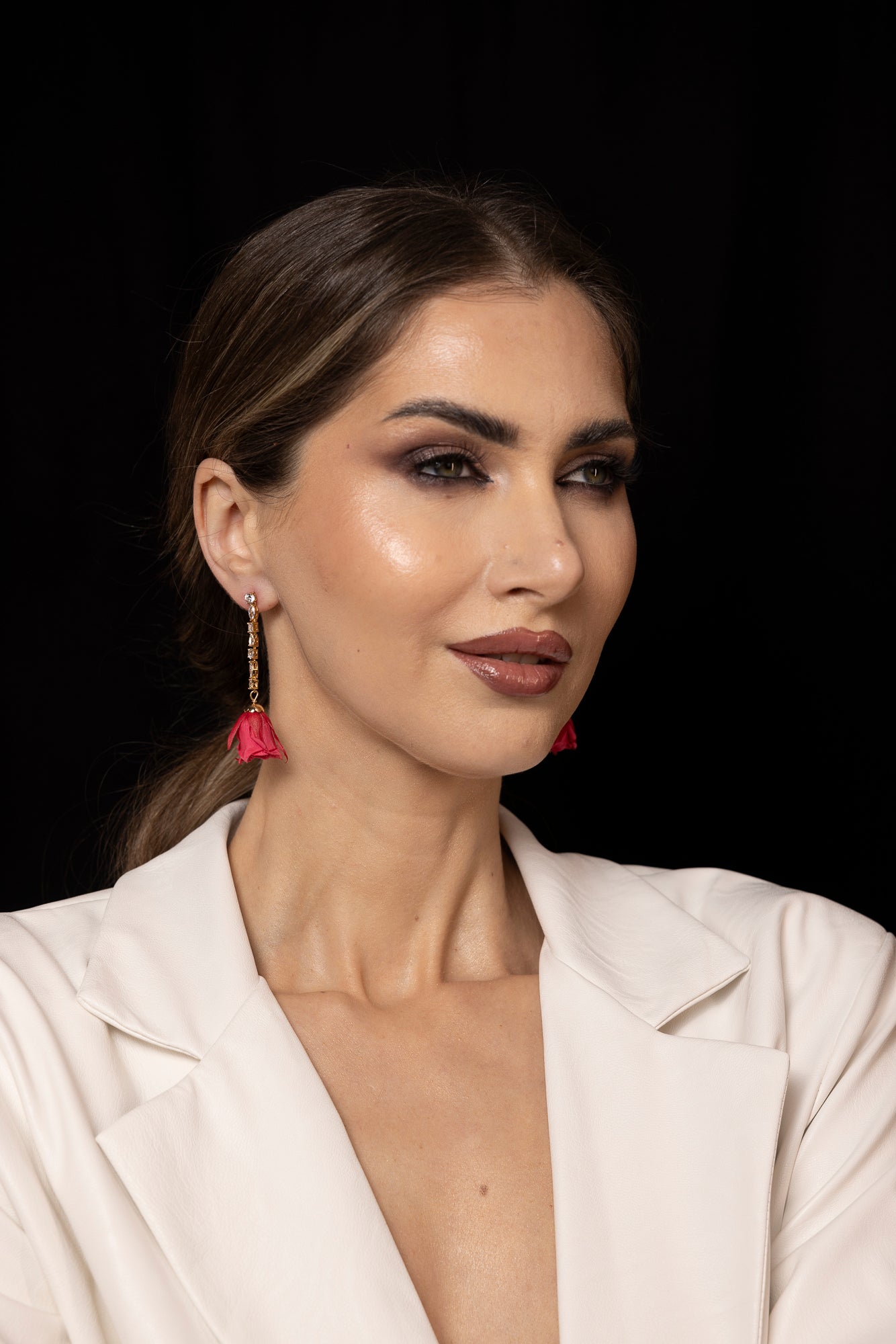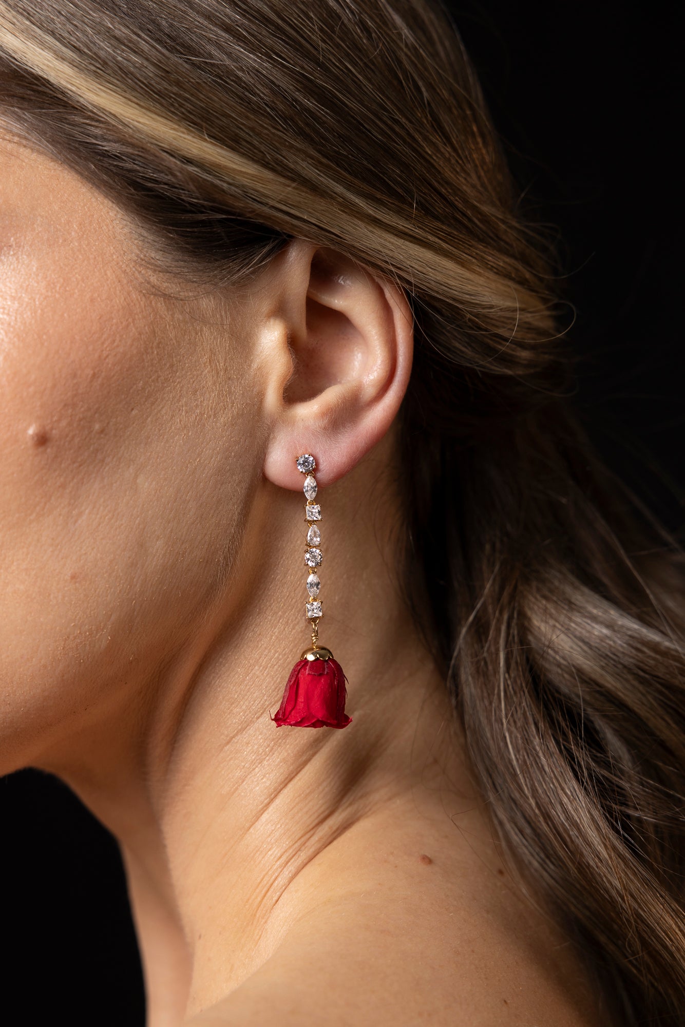 These multi-shape tennis earrings are perfect for date night or a formal event. Rose are shown in red and flamingo.
