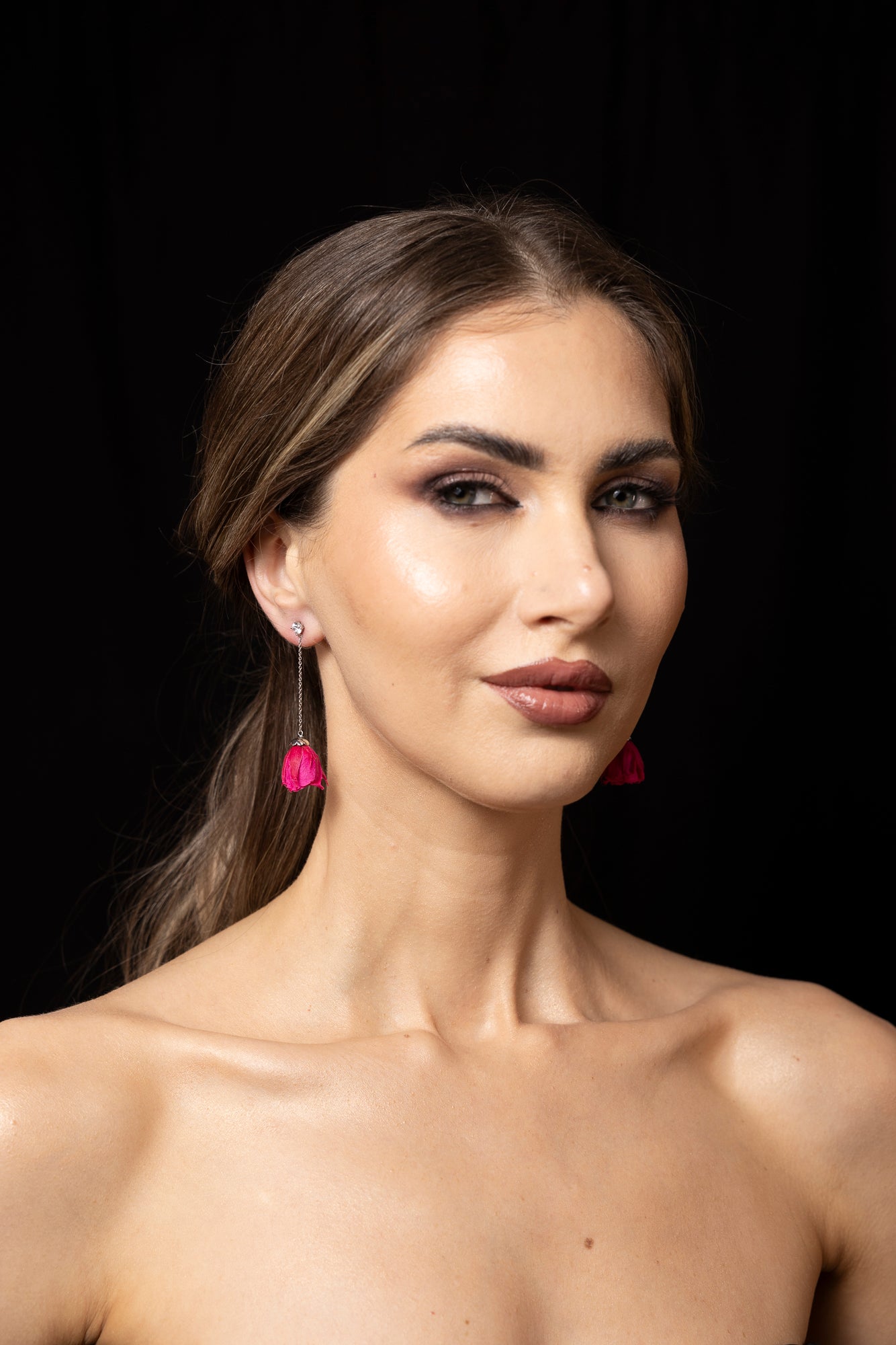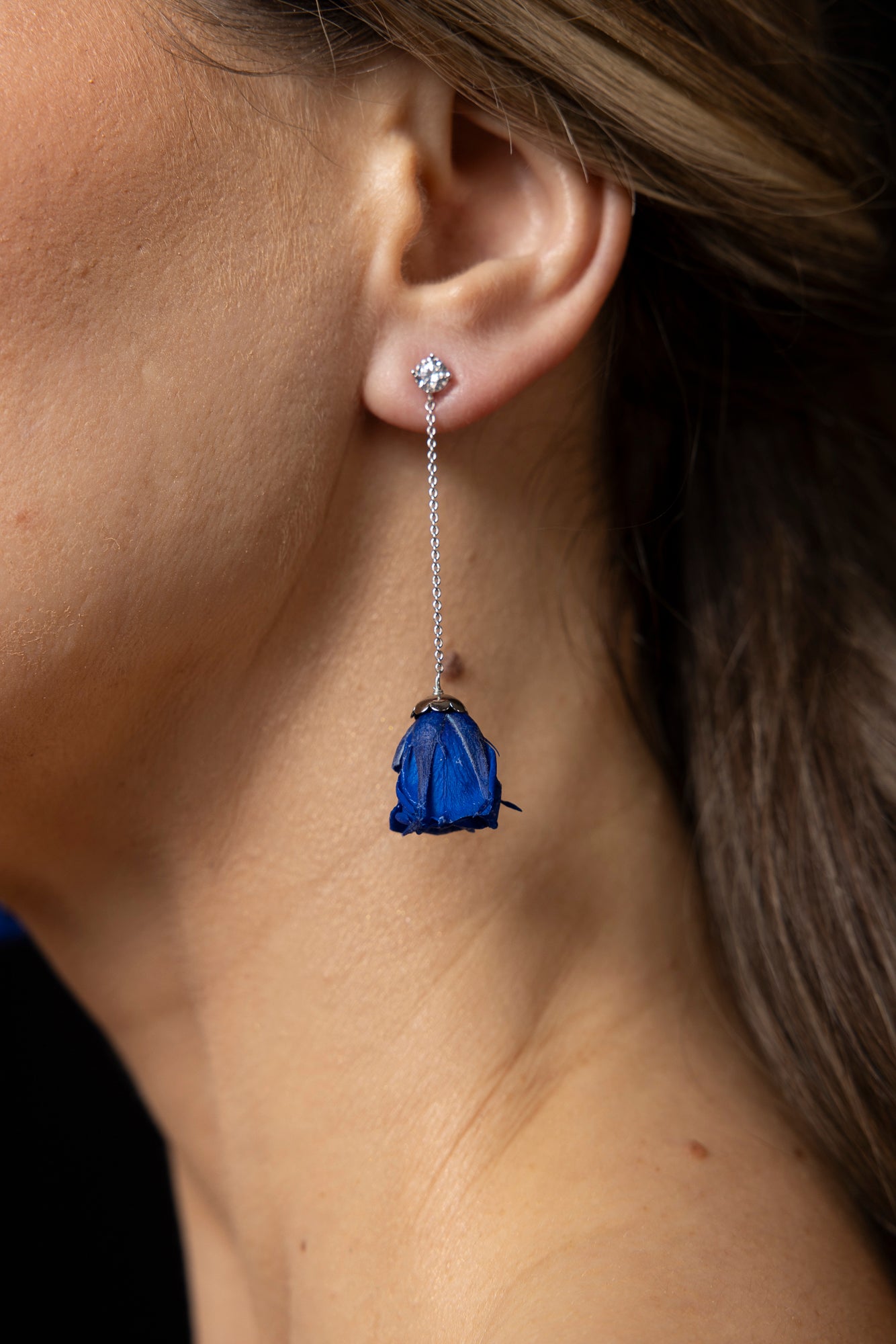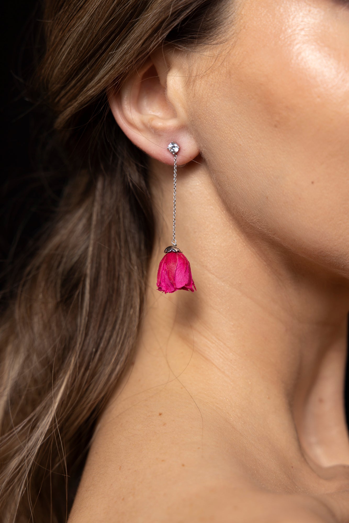 A single diamond with a rose drop - a classic and iconic look! Pair with any of our 18 rose colors for your own iconic pair. Roses are shown in fuchsia and dark blue.